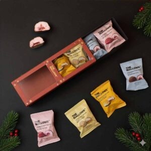 The Mallows talvine kinkekarp pakub vastupandamatut valikut täidetud vahukomme. Iga vahukommi keskel peidab end meeldiv üllatust – täidetud kas kreemja karamelli või värske, puuviljase maasikaga. Ideaalne pühadekingituseks, magusaks talviseks maiuseks või jagamiseks lähedastega.